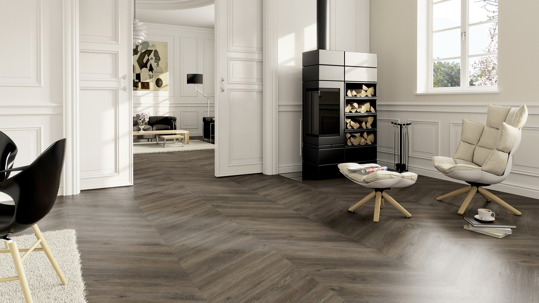 New from Sōya-Vinyl: Chevron The chevron laying pattern, also known as French herringbone, is characterised by precisely cut planks whose ends are bevelled at an angle of 60° and meet at the cut edge. This creates perfectly harmonised points that form a clear, even V-shape. Compared to the classic herringbone pattern, where the head edge of one plank meets the end of the long edge of the other plank at a 45° angle, Chevron has a calmer and more structured appearance. This unconventional openness is particularly effective in modern or prestigious interiors.