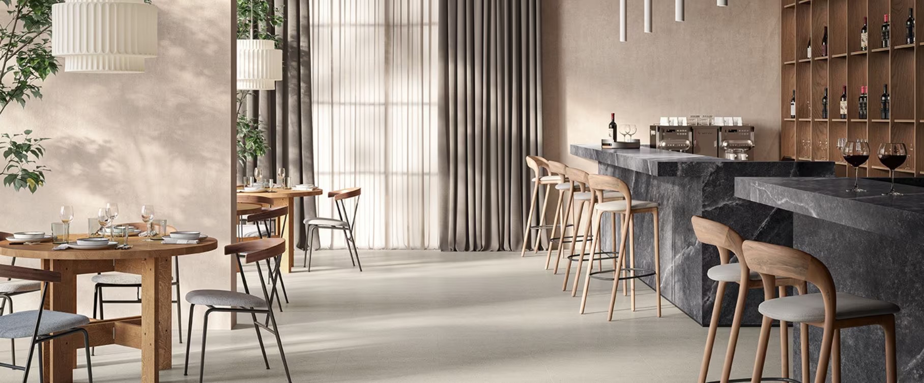 Casalgrande Padana’s research and experimentation, cutting-edge production process, and technical expertise acquired in its 60 years in the business have led to the Stonetech collection. These new technical porcelain stoneware tiles replicate the texture and effects of the rocks of the Central Alps: marble, quartz, and feldspar fragments of different sizes blend within the slab, becoming one with it.